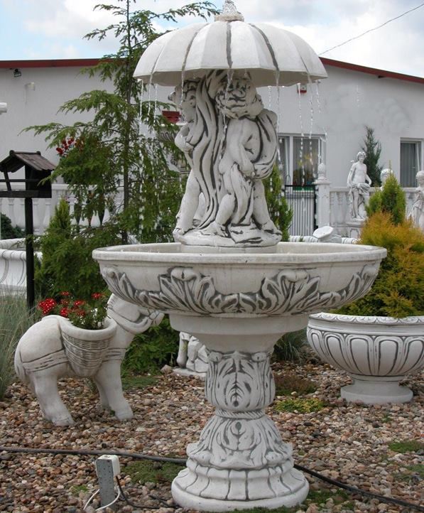 Fontanna ogrodowa wykonana jest z białego cementu odpornego na warunki atmosferyczne. Szum wody wprowadza miły nastrój w ogrodzie. Może stanowić idealna ozdobę ogrodu, parku, hotelu. Na zimę należy opróżnić z wody misy fontanny