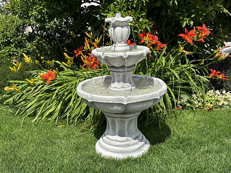 Fontanna ogrodowa wykonana jest z białego cementu odpornego na warunki atmosferyczne. Szum wody wprowadza miły nastrój w ogrodzie. Może stanowić idealna ozdobę ogrodu, parku, hotelu. Na zimę należy opróżnić z wody misy fontanny