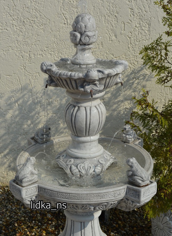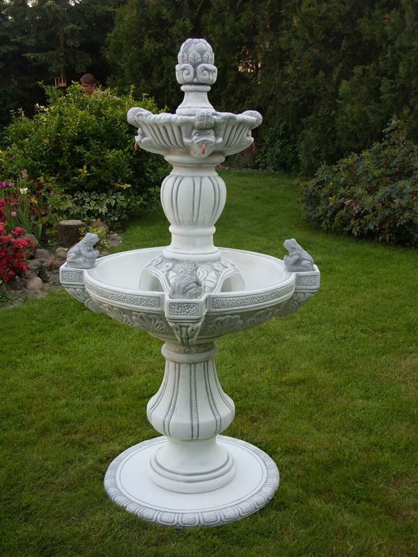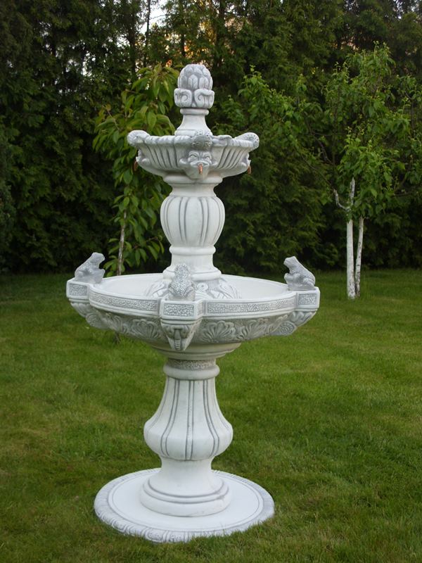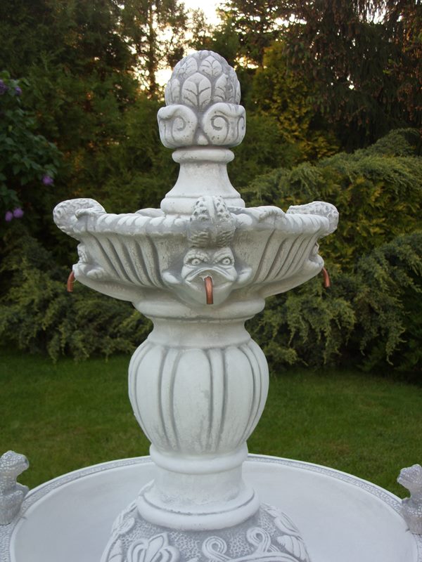 Fontanna ogrodowa wykonana jest z białego cementu odpornego na warunki atmosferyczne. Szum wody wprowadza miły nastrój w ogrodzie. Może stanowić idealna ozdobę ogrodu, parku, hotelu. Na zimę należy opróżnić z wody misy fontanny